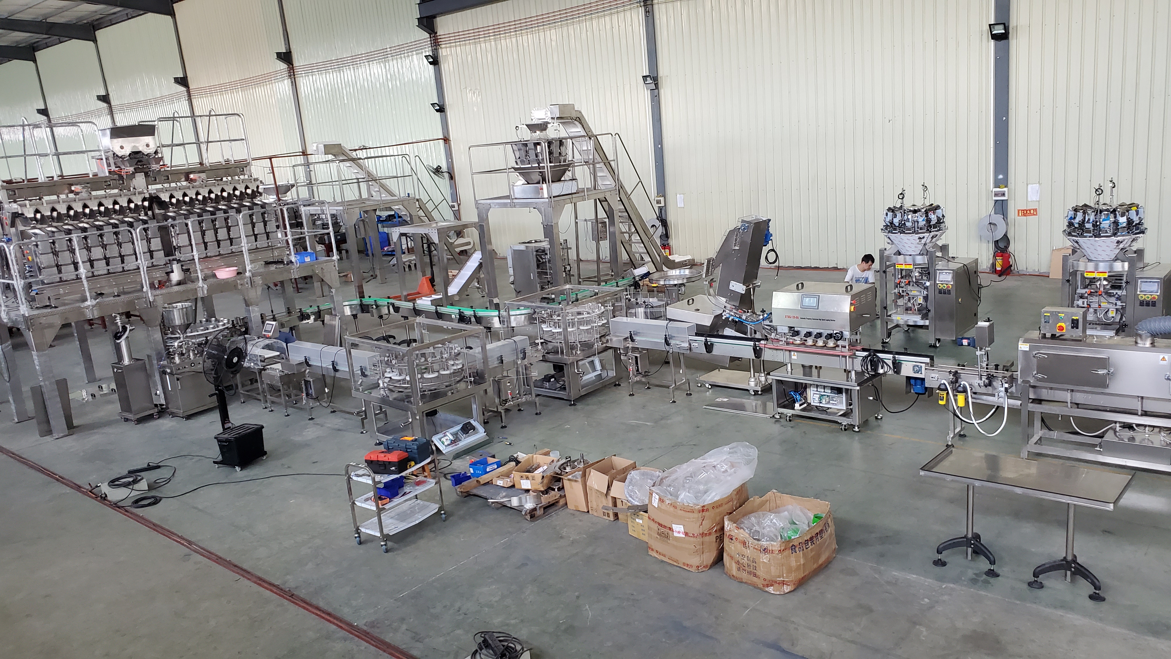 Botelo-pakaĵlinio por piklado per linia kombina ŝraŭba pezilo.