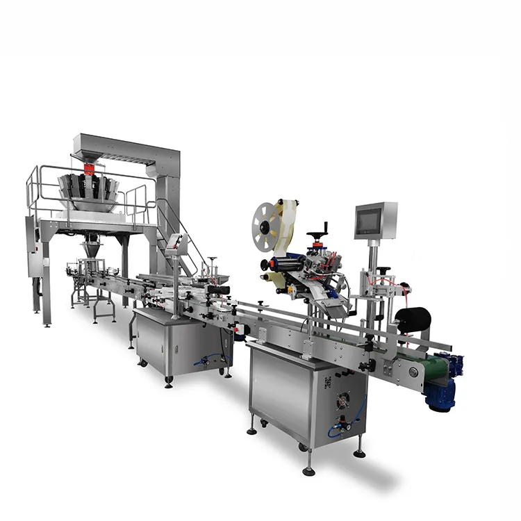 3. ម៉ាស៊ីនវេចខ្ចប់ពាងដោយស្វ័យប្រវត្តិយ៉ាងពេញលេញអាចថ្លឹងទម្ងន់ បំពេញ ត្រា និងស្លាក។