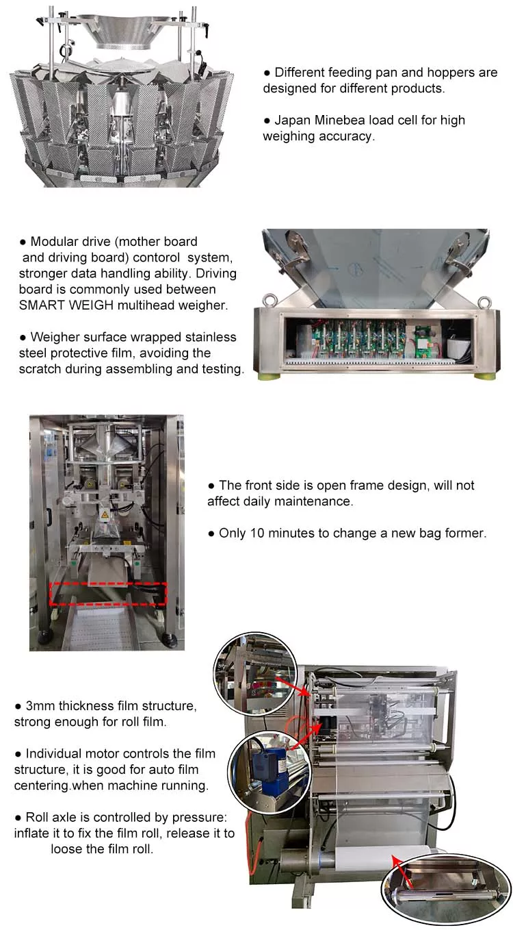 ម៉ាស៊ីនវេចខ្ចប់ដោយស្វ័យប្រវត្តិពេញដោយភាពជាក់លាក់ខ្ពស់ ថ្លឹងទម្ងន់បំពេញបាយ ខូគីអាហារ 10 14 scale hopper multihead weighter, Vertical Forming Filling Sealing Pillow Bag ម៉ាស៊ីនវេចខ្ចប់ពហុមុខងារ
