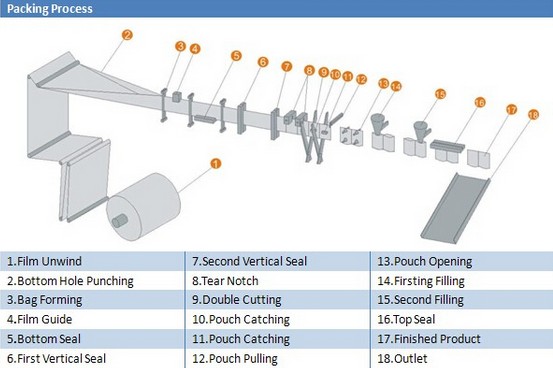 Pożywny: Produkt przeznaczony do pakowania jest wrzucany do uformowanej torebki. Aparatura napełniająca, taka jak waga wielogłowicowa lub napełniarka ślimakowa, zapewnia prawidłowy pomiar produktu.