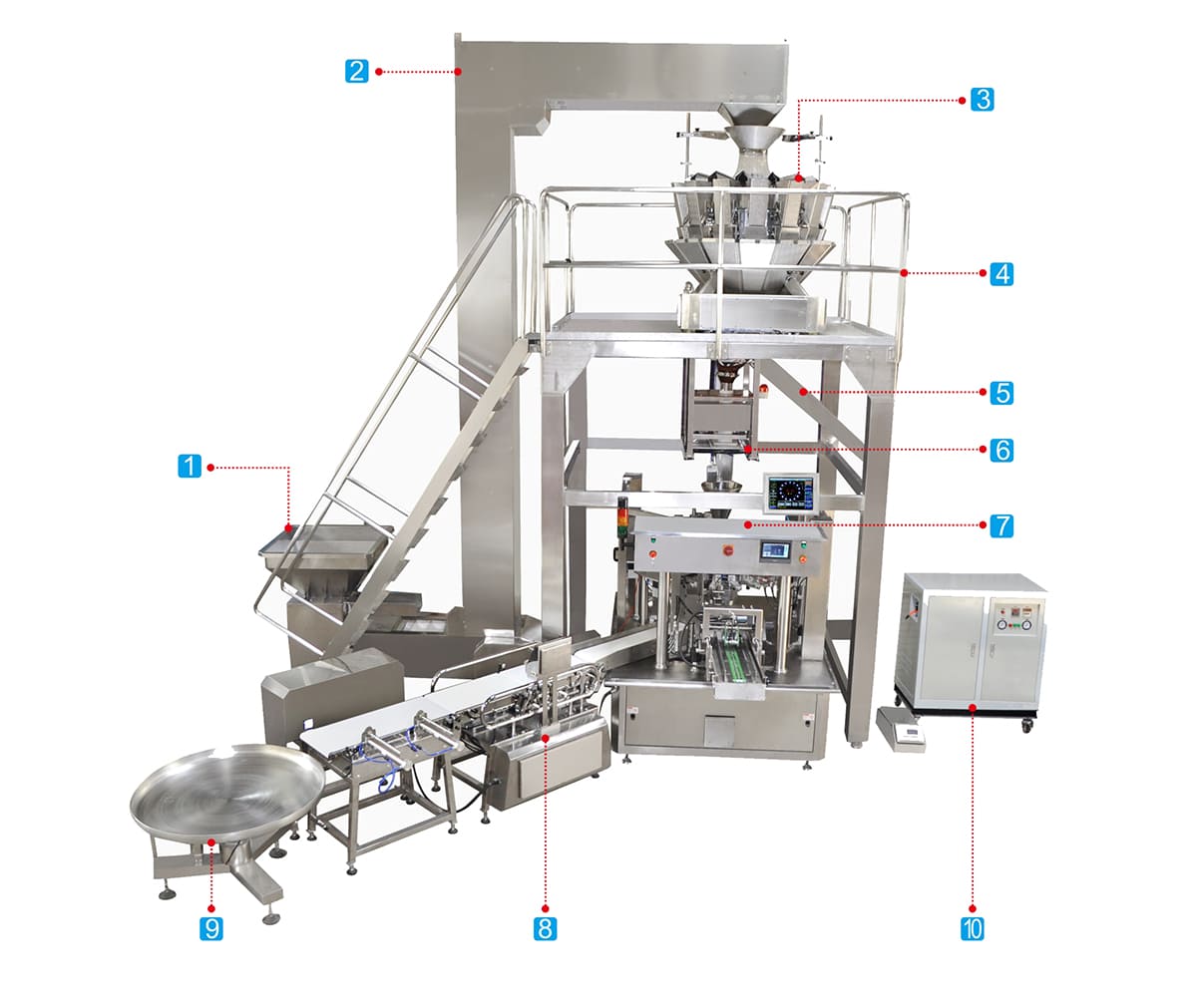 Muundo wa Mfumo uliojumuishwa: Usawazishaji kati ya kipima uzito cha vichwa vingi na mashine ya kufunga huwezesha mizunguko laini na ya haraka ya ufungaji.