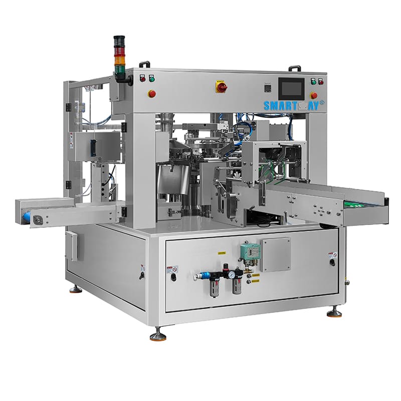 1. Upakiaji na Ufunguzi wa Kipochi : Mifuko iliyotengenezwa awali (kama vile mifuko ya kusimama au kijaruba bapa) hupakiwa kwenye hopa ya jarida. Mkono wa roboti au ufyonzaji wa utupu huchukua kila kifuko na kukiweka kwenye jukwa la indexing la mzunguko. Katika vituo vya kwanza, pochi inashikiliwa na kufunguliwa kwa usalama—vishikizo vya mitambo na jeti za hewa (au utupu) huhakikisha kuwa mfuko umefunguliwa kwa ajili ya kujazwa. Kwa mifuko iliyo na zipu zinazoweza kufungwa, kifaa kinaweza kufungua zipu mapema ili kuruhusu kujaza bila kizuizi.